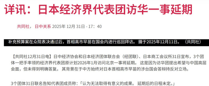 就在中方接待多国政要的同时,日本却遭遇了意料之外的冷场,由日本三大经济团体组织的代表团原本计划1月下旬访问中国,规模不小,200人左右,目标也很明确:推动中日经贸合作、争取与中方高层会面。然而,直到出发前,中方未对高层会面请求作出明确安排,最终日方只能宣布推迟行程。